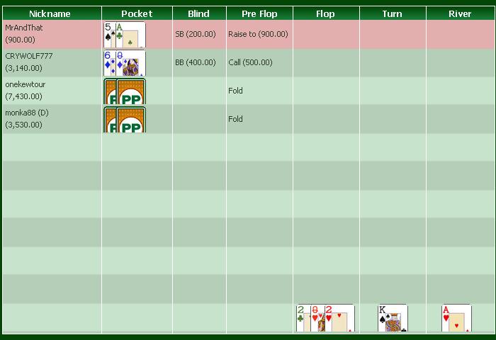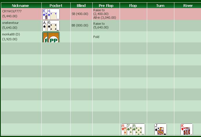 1 fold, Hero raises to 800, lodscarface goes all-in 3,140, 3 folds, alko62 calls 3,040, 1 fold, Hero calls 2,340
