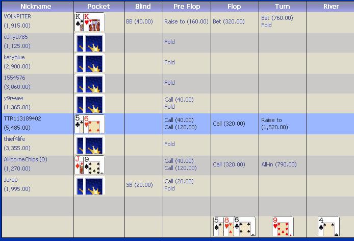 | мда трындец жестко вылетел из 11 баксового турнира No Limit Holdem Tournament FullTiltPoker 9 Players Hand Conversion Powered by weaktight.com Super Stack $10K Guarantee Stacks: UTG testerlain (12,385) UTG+1 spongebob11 (62,858) MP1 Brizzy23 (23,295) MP2 HER VAM 857raz (12,470) MP3 Burns33 (6,475) CO kidelpiero26 (6,465) BTN Couttawa (11,990) SB SmoothCall419 (8,214) BB Hero (11,530) Blinds: 300/600 Ante 75 Pre-Flop: (1,575, 9 players) Hero is BB A 10 testerlain raises to 1,200, 6 folds, SmoothCall419 calls 900, Hero calls 600 Flop: A 10 2 (4,275, 3 players) SmoothCall419 checks, Hero bets 1,800, testerlain raises to 3,600, SmoothCall419 folds, Hero goes all-in 10,255, testerlain calls 6,655 Turn: Q (24,785, 2 players, 1 all-in) River: K (24,785, 2 players, 1 all-in) Final Pot: 24,785 Hero shows two pair, Aces and Tens A 10 testerlain shows a straight, Ace high A J testerlain wins 24,785 (net +13,255) SmoothCall419 lost 1,275 Hero lost 11,530 жопа итм так близко было и стек 20бб(6-7м) обидно