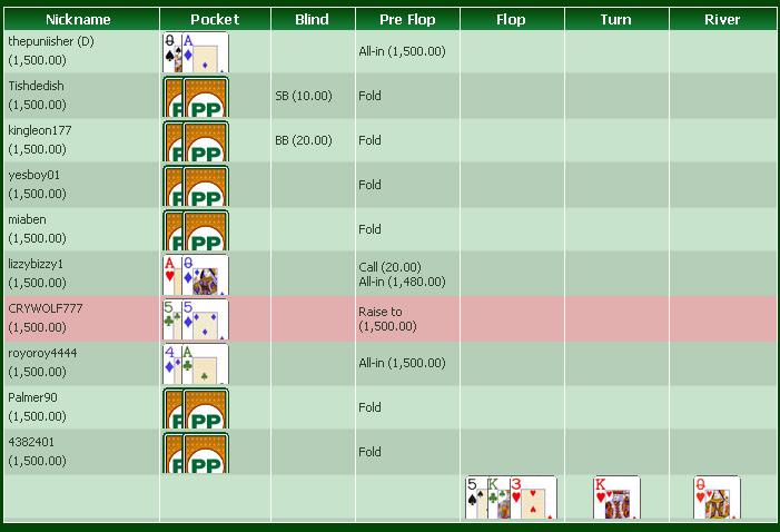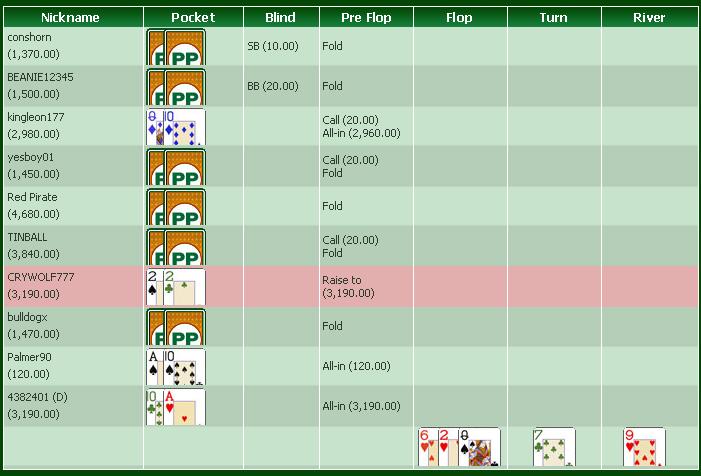 No Limit Holdem Tournament FullTiltPoker 9 Players Hand Conversion Powered by weaktight.com Daily Dollar Rebuy Stacks: UTG ALL IN 878 (3,000) UTG+1 mot444 (3,430) MP1 toomuchpants (3,000) MP2 Hero (2,990) MP3 SLBSLBSLB (1,470) CO Gazdius (2,940) BTN www maxpace nl (1,470) SB TorzhRaz (3,030) BB xmikex1971 (1,170) Blinds: 10/20 Pre-Flop: (30, 9 players) Hero is MP2 K K 1 fold, mot444 calls 20, 1 fold, Hero raises to 333, 3 folds, TorzhRaz calls 323, 1 fold, mot444 folds Flop: 8 5 9 (706, 2 players) TorzhRaz checks, Hero bets 444, TorzhRaz raises to 888, Hero goes all-in 2,657, TorzhRaz calls 1,769 Turn: 6 (6,020, 2 players, 1 all-in) River: 6 (6,020, 2 players, 1 all-in) Final Pot: 6,020 Hero shows two pair, Kings and Sixes K K TorzhRaz shows a full house, Nines full of Sixes 9 9 TorzhRaz wins 6,020 (net +3,030) Hero lost 2,990 mot444 lost 20 ну все старта нули хорошо ,больше не где нерегаюсь,завтра хочу на раьоту сдходить,оффлайн банкролл поднять