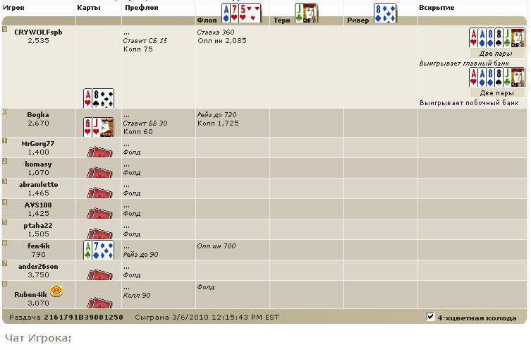 еще один аут No Limit Holdem Tournament FullTiltPoker 9 Players Hand Conversion Powered by weaktight.com $6,000 Guarantee Stacks: UTG Badhabit11 (3,235) UTG+1 nickstassi (2,650) MP1 Hero (895) MP2 KatiE5952 (1,750) MP3 avenuem1 (2,060) CO Tuareg_688 (2,330) BTN credit9000 (1,260) SB Erudas (2,130) BB scaly59 (2,450) Blinds: 25/50 Pre-Flop: (75, 9 players) Hero is MP1 10 10 2 folds, Hero raises to 205, 1 fold, avenuem1 calls 205, 3 folds, scaly59 goes all-in 2,450, Hero goes all-in 690, avenuem1 goes all-in 1,855 Flop: 7 K K (5,430, 3 players, 3 all-in) Turn: 8 (5,430, 3 players, 3 all-in) River: 8 (5,430, 3 players, 3 all-in) Final Pot: 5,430 Hero shows two pair, Kings and Tens 10 10 avenuem1 shows two pair, Aces and Kings A A scaly59 shows two pair, Aces and Kings A A scaly59 wins 2,910 (net +460) avenuem1 wins 2,520 (net +460) Hero lost 895 No Limit Holdem Tournament FullTiltPoker 9 Players Hand Conversion Powered by weaktight.com $3 + $0.30 Tournament Stacks: UTG Hero (743) UTG+1 chamarelle (39,060) MP1 senegaulois06 (16,435) MP2 Kolos1986 (9,490) MP3 BonnieCool (5,996) CO 1Dustin1 (9,435) BTN AKV22 (15,992) SB atomic sherpa (5,267) BB pace304 (2,080) Blinds: 100/200 Pre-Flop: (300, 9 players) Hero is UTG A A Hero goes all-in 743, chamarelle calls 743, senegaulois06 calls 743, 1 fold, BonnieCool calls 743, 4 folds Flop: A J 2 (3,272, 4 players, 1 all-in) chamarelle checks, senegaulois06 checks, BonnieCool checks Turn: 5 (3,272, 4 players, 1 all-in) chamarelle checks, senegaulois06 checks, BonnieCool checks River: 3 (3,272, 4 players, 1 all-in) chamarelle checks, senegaulois06 checks, BonnieCool checks Final Pot: 3,272 Hero shows three of a kind, Aces A A chamarelle shows 6 7 senegaulois06 shows Q Q BonnieCool shows K K Hero wins 3,272 (net +2,529) chamarelle lost 743 senegaulois06 lost 743 BonnieCool lost 743