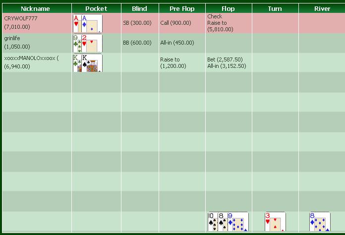 | клоуны ппц,видимо чел мега лаковые если идет аллин вот так No Limit Holdem Tournament FullTiltPoker 9 Players Hand Conversion Powered by weaktight.com Daily Dollar Rebuy Stacks: UTG TexasDennis (2,650) UTG+1 jedimaster03 (1,515) MP1 drs98535 (4,240) MP2 Zmeus (4,820) MP3 zcloudrider (3,945) CO OLDE_GUY (1,500) BTN gt_bwoy (2,925) SB Raidhard (4,430) BB Hero (3,060) Blinds: 25/50 Pre-Flop: (75, 9 players) Hero is BB A A 4 folds, zcloudrider calls 50, 2 folds, Raidhard calls 25, Hero raises to 300, zcloudrider calls 250, Raidhard folds Flop: 2 8 Q (650, 2 players) Hero bets 350, zcloudrider raises to 700, Hero goes all-in 2,760, zcloudrider calls 2,060 Turn: K (6,170, 2 players, 1 all-in) River: 6 (6,170, 2 players, 1 all-in) Final Pot: 6,170 zcloudrider shows King Queen high 10 9 Hero shows a pair of Aces A A Hero wins 6,170 (net +3,110) zcloudrider lost 3,060 Raidhard lost 50 скинул но сука спорное решения,но аллин ппц No Limit Holdem Tournament FullTiltPoker 8 Players Hand Conversion Powered by weaktight.com Daily Dollar Rebuy Stacks: UTG zcloudrider (430) UTG+1 OLDE_GUY (1,500) MP1 gt_bwoy (2,040) MP2 Raidhard (4,380) CO Hero (6,145) BTN TexasDennis (2,575) SB jedimaster03 (3,105) BB Zmeus (4,770) Blinds: 25/50 Pre-Flop: (75, 8 players) Hero is CO 9 9 1 fold, OLDE_GUY calls 50, 2 folds, Hero calls 50, TexasDennis calls 50, 1 fold, Zmeus checks Flop: 8 2 4 (225, 4 players) Zmeus bets 225, OLDE_GUY calls 225, Hero raises to 1,125, 1 fold, Zmeus goes all-in 4,720, OLDE_GUY folds, Hero folds Final Pot: 6,295 Zmeus wins 6,295 (net +1,525) OLDE_GUY lost 275 Hero lost 1,175 TexasDennis lost 50