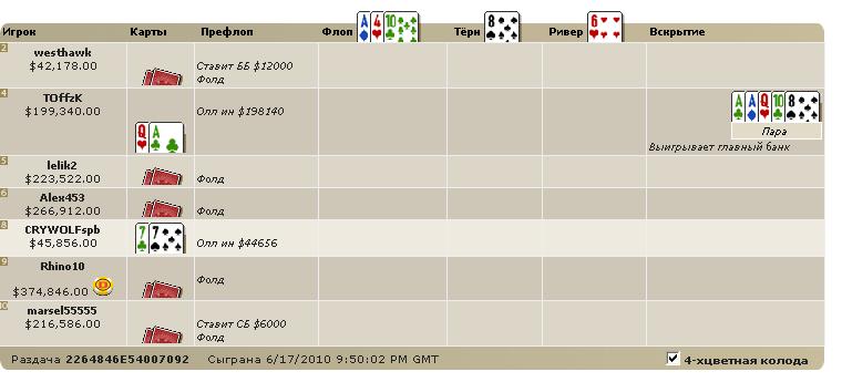 Quote (imba_freelance) Ладно бы нормальное количество было.. а 5 чипов - это ваще фигня. Я полгода на кейке играю, наиграл пару сотен чипов, а всё что я могу купить на них - пару футболок. там есть халявный турнир, 1000 баксов за 1 чип не стал ставить на ривере,чет оп мувер какой то No Limit Holdem Tournament FullTiltPoker 8 Players Hand Conversion Powered by weaktight.com MSOP Event #34 Stacks: UTG Luigy911 (3,395) UTG+1 Watchout1110 (2,935) MP1 Hero (3,030) MP2 PRO-IMEE (150) CO Donnie Dodo (2,955) BTN jidsmason (5,980) SB idwish (3,150) BB fab27 (2,335) Blinds: 15/30 Pre-Flop: (45, 8 players) Hero is MP1 K J 2 folds, Hero raises to 75, 4 folds, fab27 raises to 180, Hero calls 105 Flop: 10 J 8 (375, 2 players) fab27 checks, Hero bets 210, fab27 raises to 510, Hero calls 300 Turn: Q (1,395, 2 players) fab27 checks, Hero checks River: J (1,395, 2 players) fab27 checks, Hero checks Final Pot: 1,395 fab27 shows 7 7 Hero shows three of a kind, Jacks K J Hero wins 1,395 (net +705) fab27 lost 690